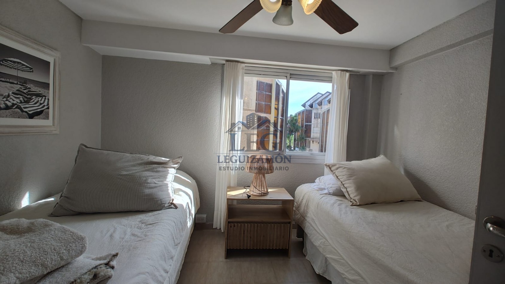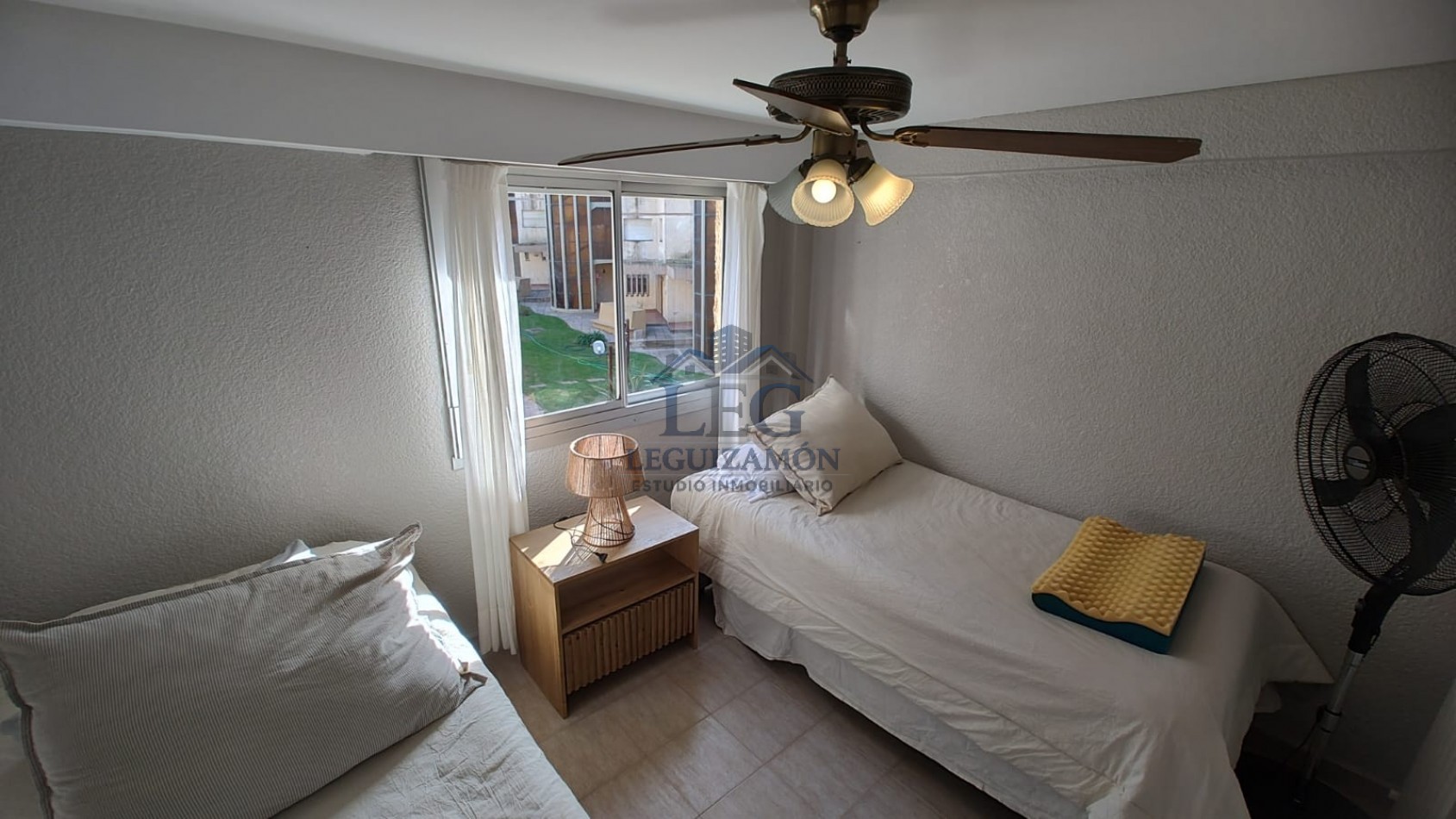 - Dormitorio con dos camas individuales con ventilador de techo.